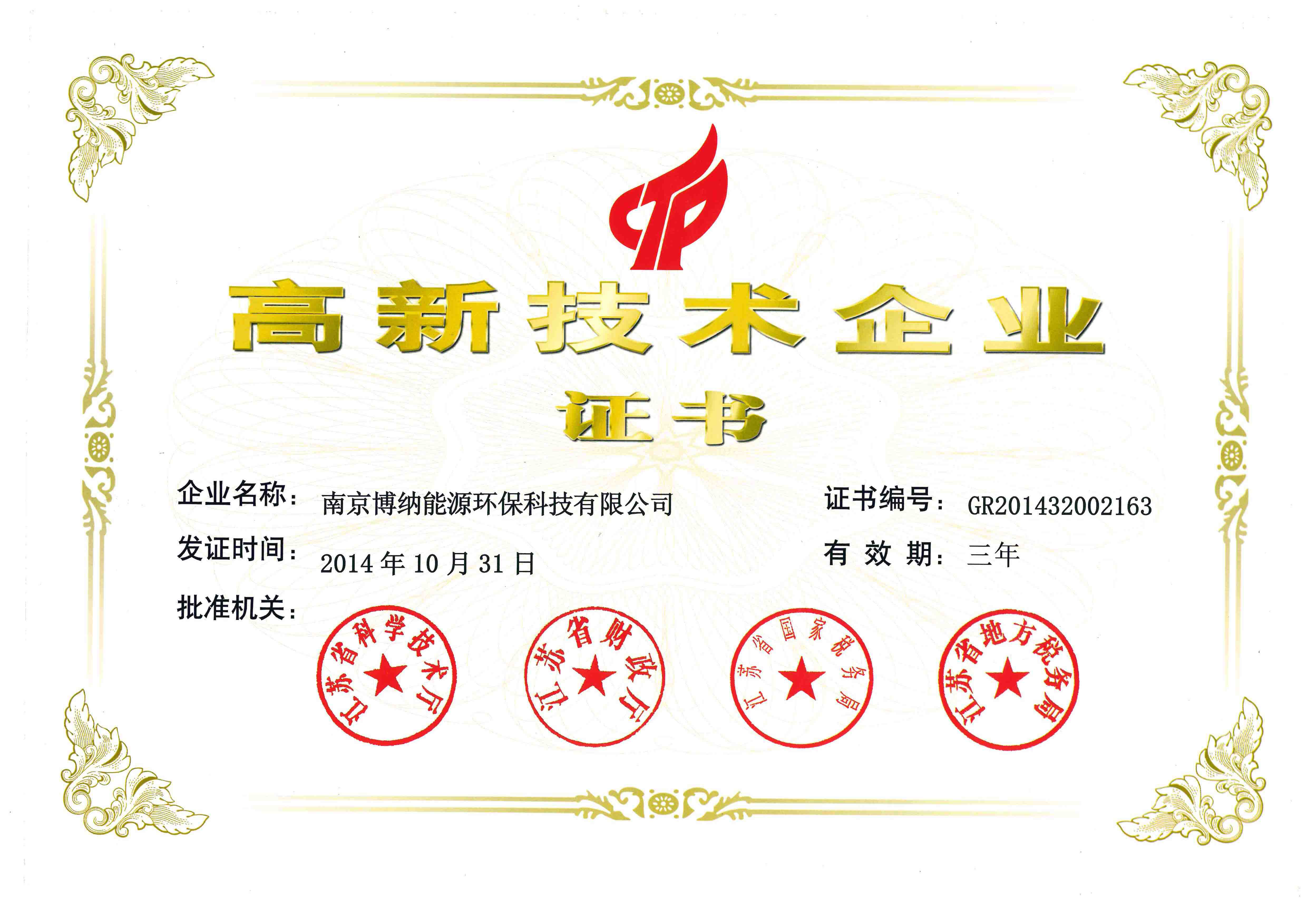 2014年10月31日,經省科技廳等相關部門組織專家評審、公示后,博納成功獲得國家高新技術企業認定,本次高新技術企業認證的通過充分顯示了公司的整體實力,同時也是各部門人員相互配合,辛勤付出所取得的結果。